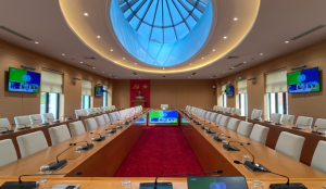 Phòng họp sử dụng hệ âm thanh Televic của Bỉ, kết hợp truyền dẫn, điều khiển, trình chiếu không dây và ma trận của ATEN. Giải pháp đảm bảo chất lượng âm thanh, hiển thị linh hoạt, tối ưu hóa thông tin.