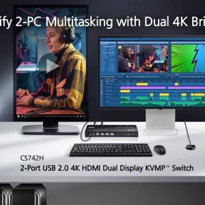 Bộ chuyển mạch KVM 2 cổng của ATEN – model CS742H – được thiết kế để nâng cao hiệu suất làm việc với hai hệ thống máy tính đồng thời nhưng vẫn giữ cho góc làm việc gọn gàng. Với chỉ một bàn phím và một chuột, bạn có thể điều khiển cả hai máy tính và sử dụng hai màn hình HDMI chuẩn 4K60Hz một cách liền mạch.